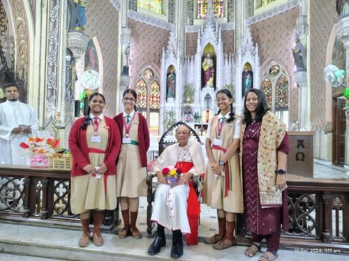 Three students (Agnes, Michelle and Brooke) of Std X along with teacher Jenny Nelson represented SJC to felicitate his Eminence, Cardinal Oswald Gracias on the occasion of his birthday, which was on 24th December