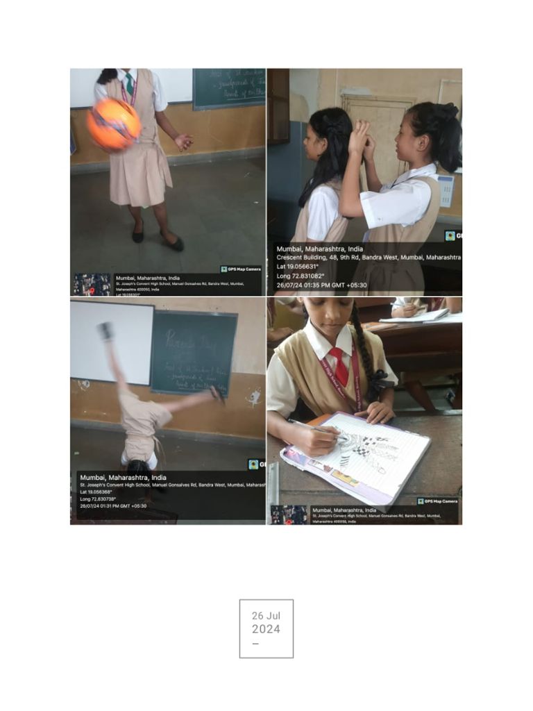 Day 5 on 26th July 2024: Skilling Day - Skill day was celebrated wherein many students showed their talent and skills through various activities such as Dogging and handling the ball differently, hairstyling, Kart wheel, Mehendi drawing etc.